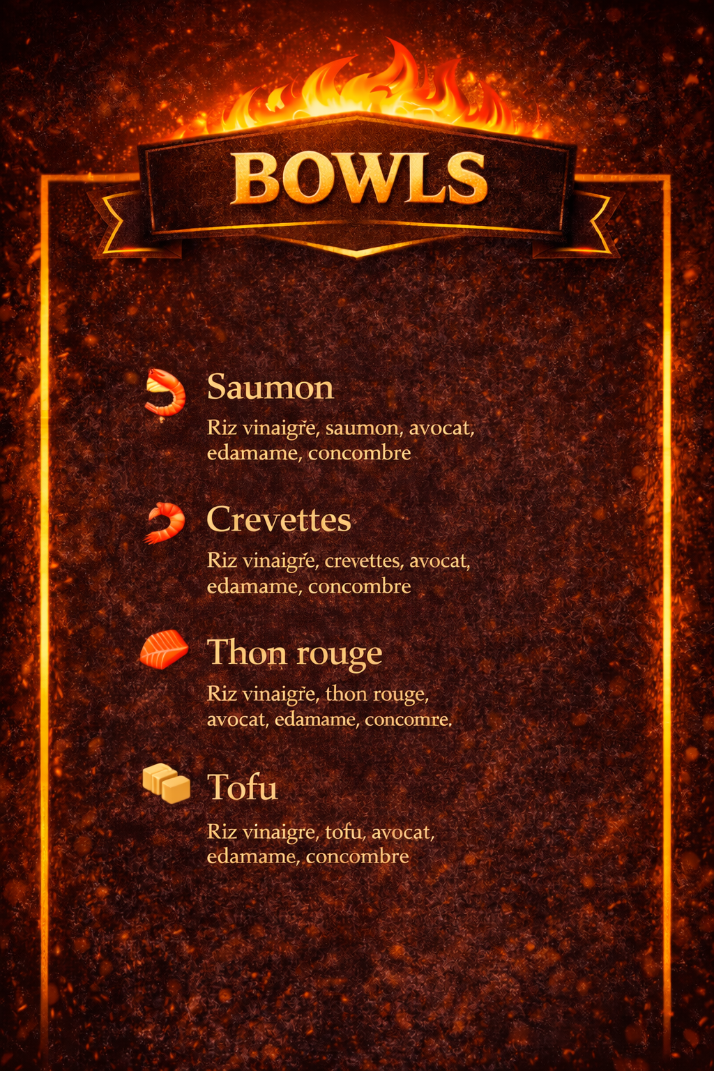 Consultez notre menu et sélectionnez vos burgers, tacos, bowls, accompagnements ou desserts.