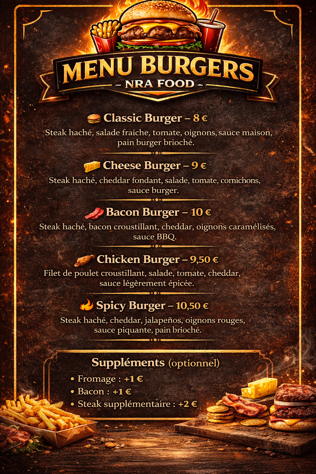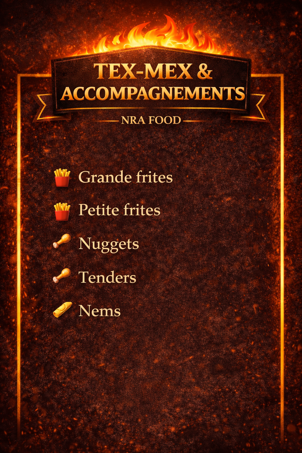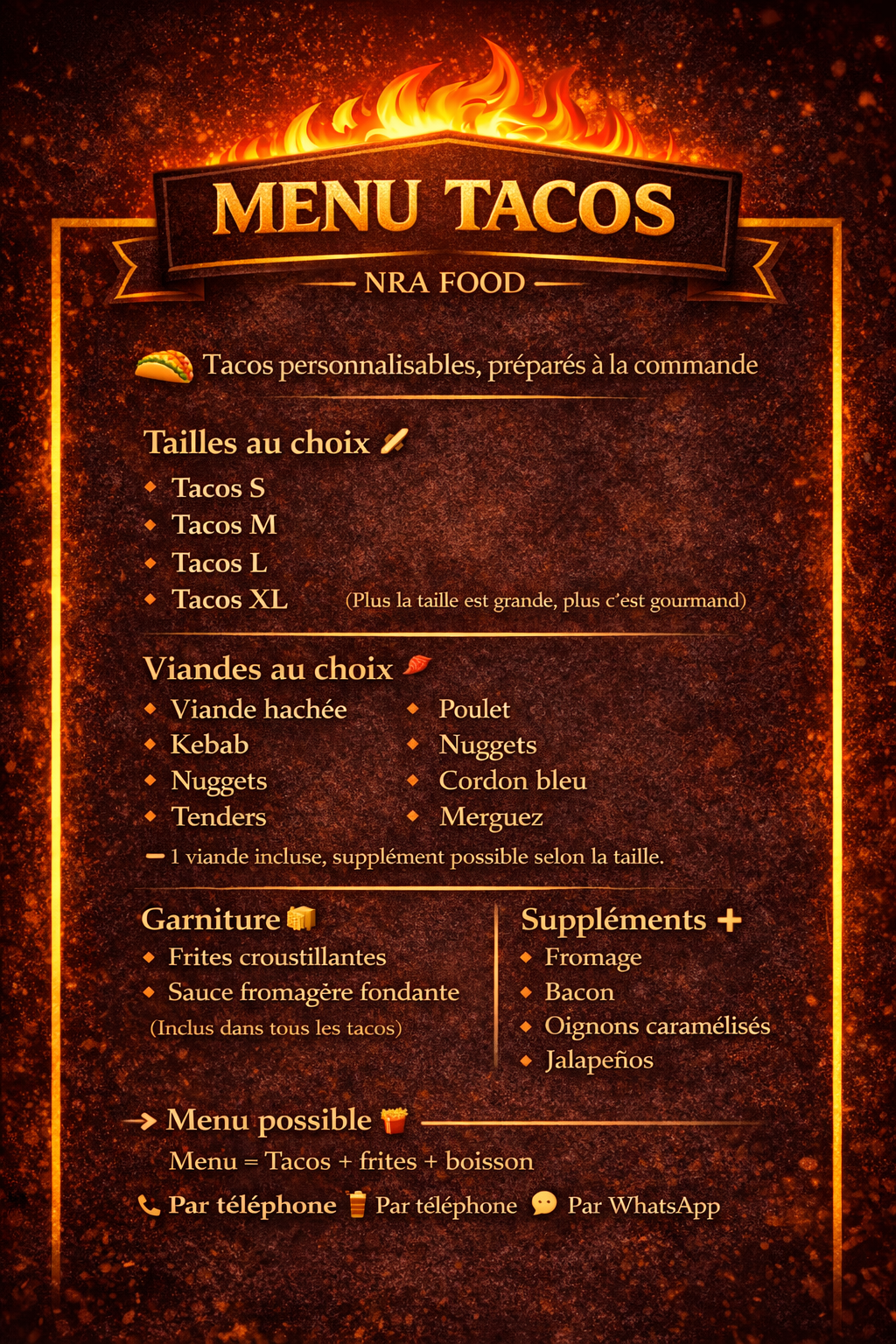 NRA FOOD est un snack local proposant des burgers, tacos, bowls, tex-mex et desserts, préparés à la commande avec des produits frais et généreux. Sur place, à emporter ou en livraison, nous vous accueillons pour un moment gourmand et convivial.